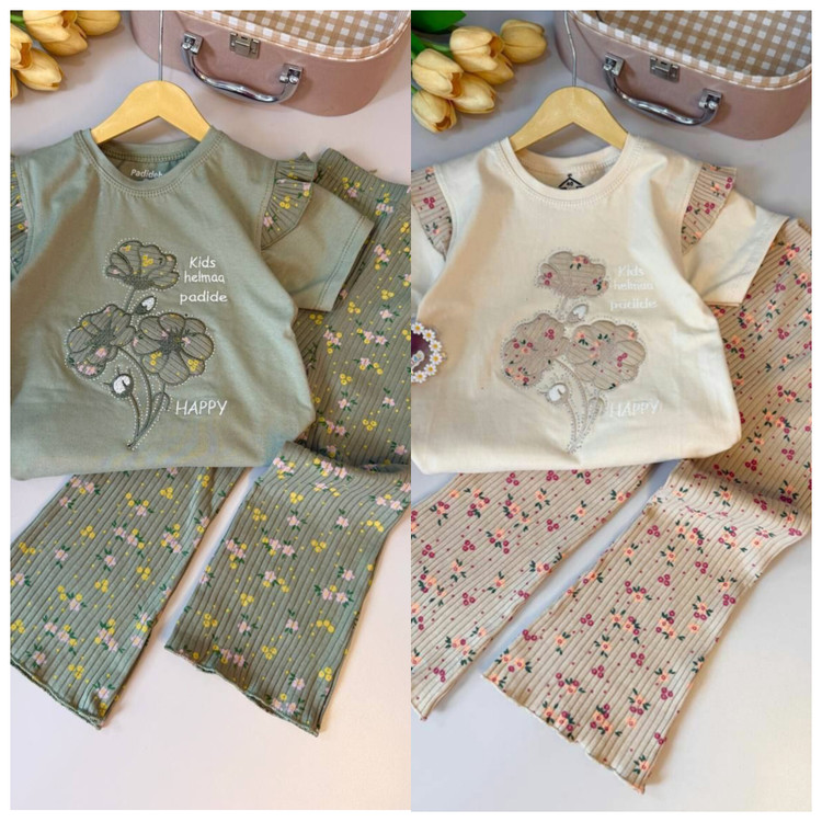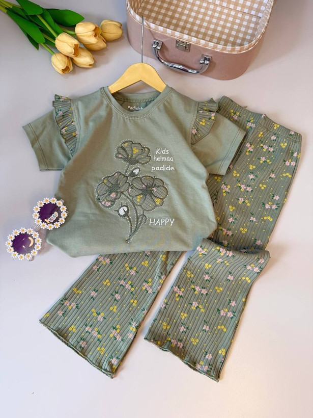 جنس تیشرت نخ پنبه گلدوزی شده، نگین های روی تیشرت کوبیده شده و کَنده نمیشه، شلوار بوت کات، کبریتی دارای کشسانی